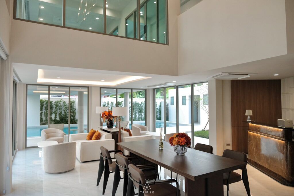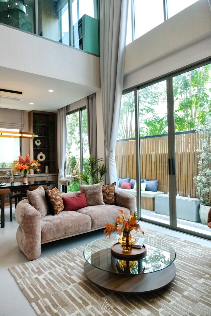 เข้ามาภายในบริเวณบ้านจะเจอกับ Living Room เลย ซึ่งจะเป็นพื้นที่แบบ Open plan ทำให้ทุกพื้นที่ สามารถ Connect กันได้ทั้งหมด