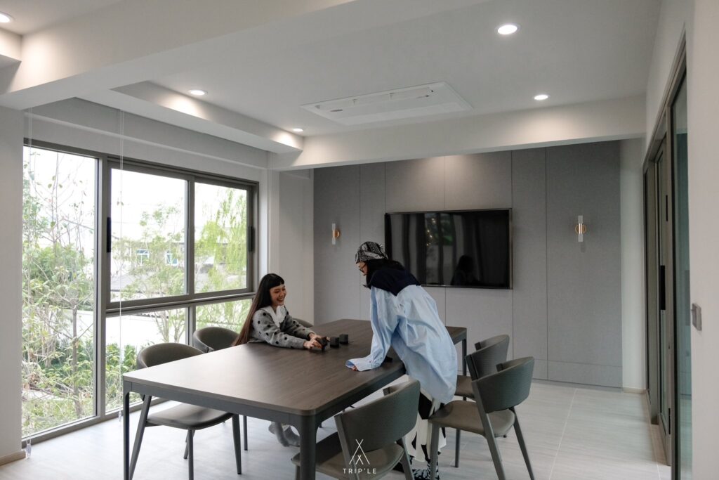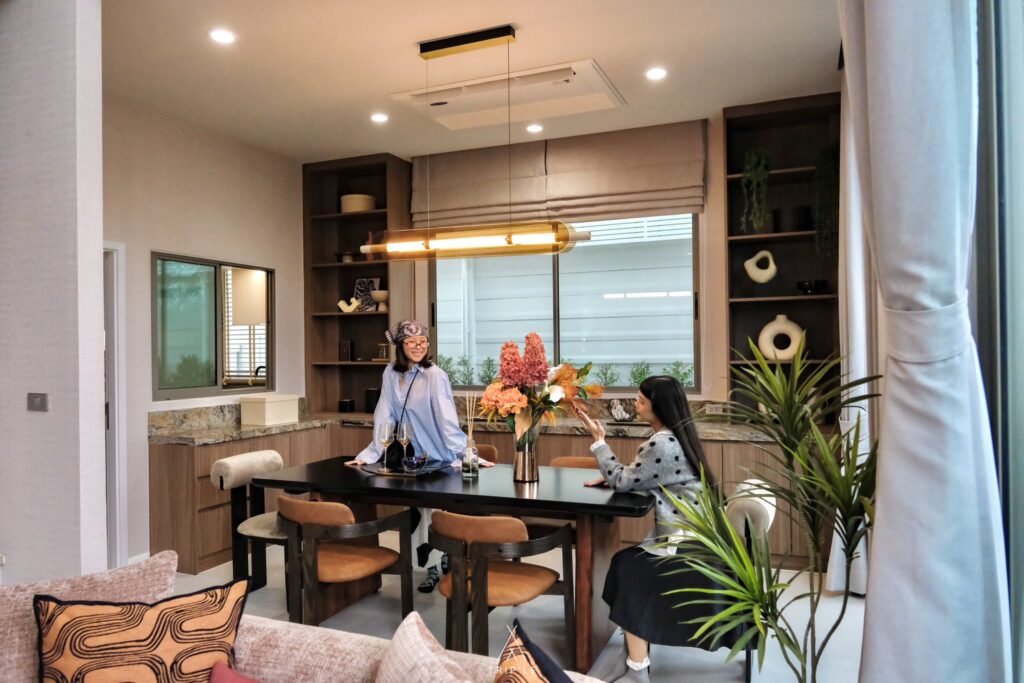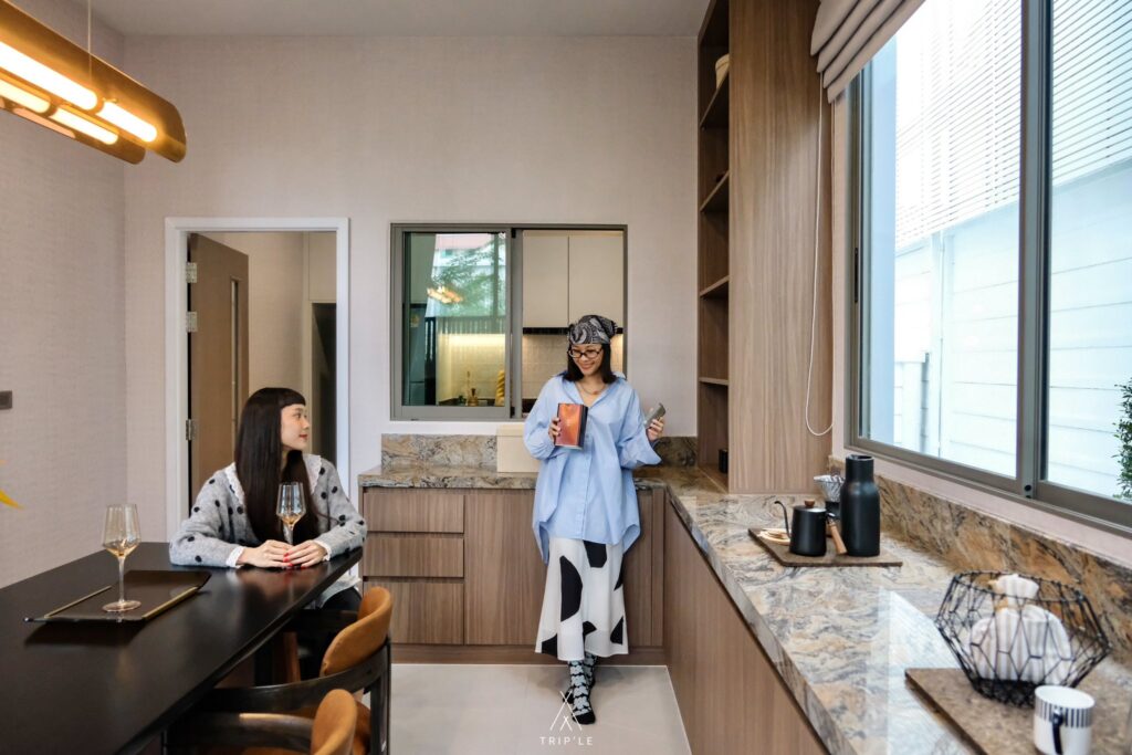 พื้นที่ส่วน Dining room ตรงนี้มีบานกระจกกั้นกับห้องครัว สามาถเสิร์ฟอาหารผ่านช่องกระจกได้เลยด้วย