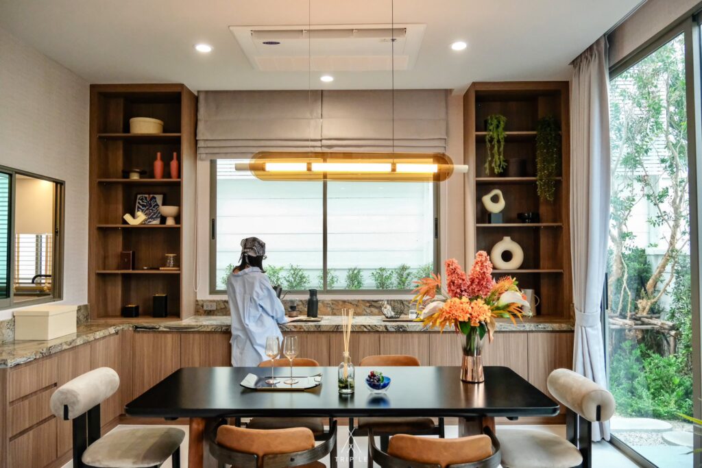 พื้นที่ส่วน Dining room ตรงนี้มีบานกระจกกั้นกับห้องครัว สามาถเสิร์ฟอาหารผ่านช่องกระจกได้เลยด้วย