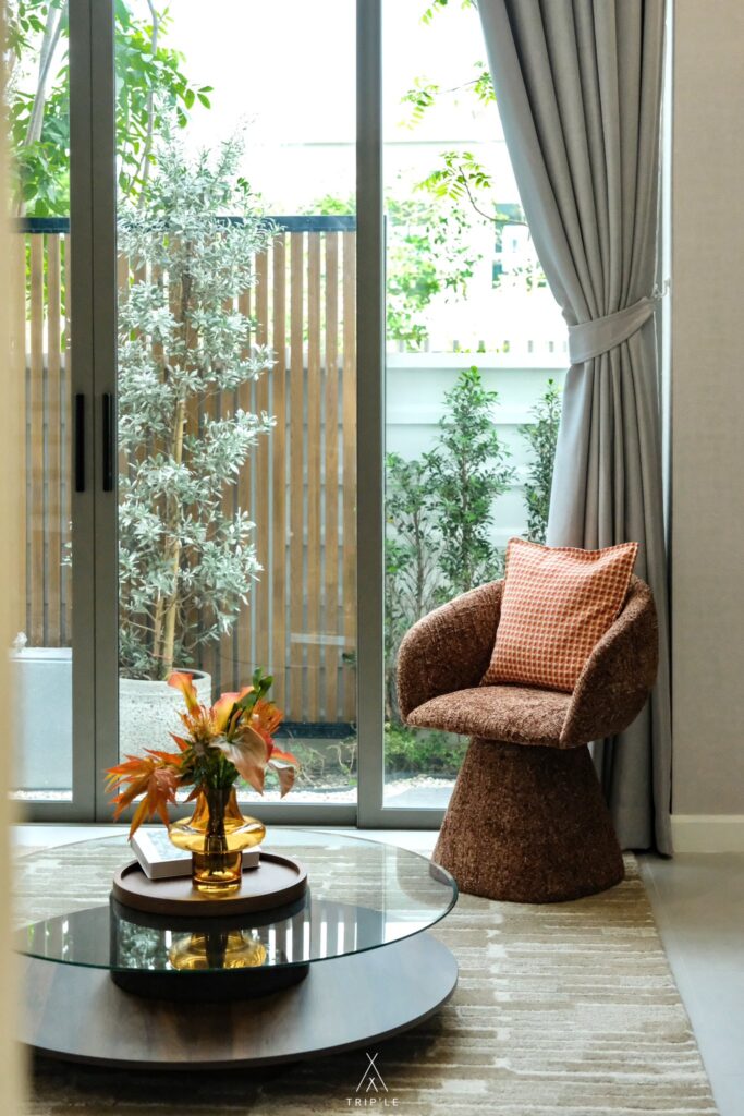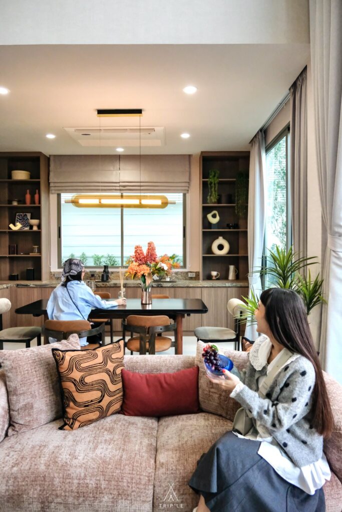 เข้ามาภายในบริเวณบ้านจะเจอกับ Living Room เลย ซึ่งจะเป็นพื้นที่แบบ Open plan ทำให้ทุกพื้นที่ สามารถ Connect กันได้ทั้งหมด