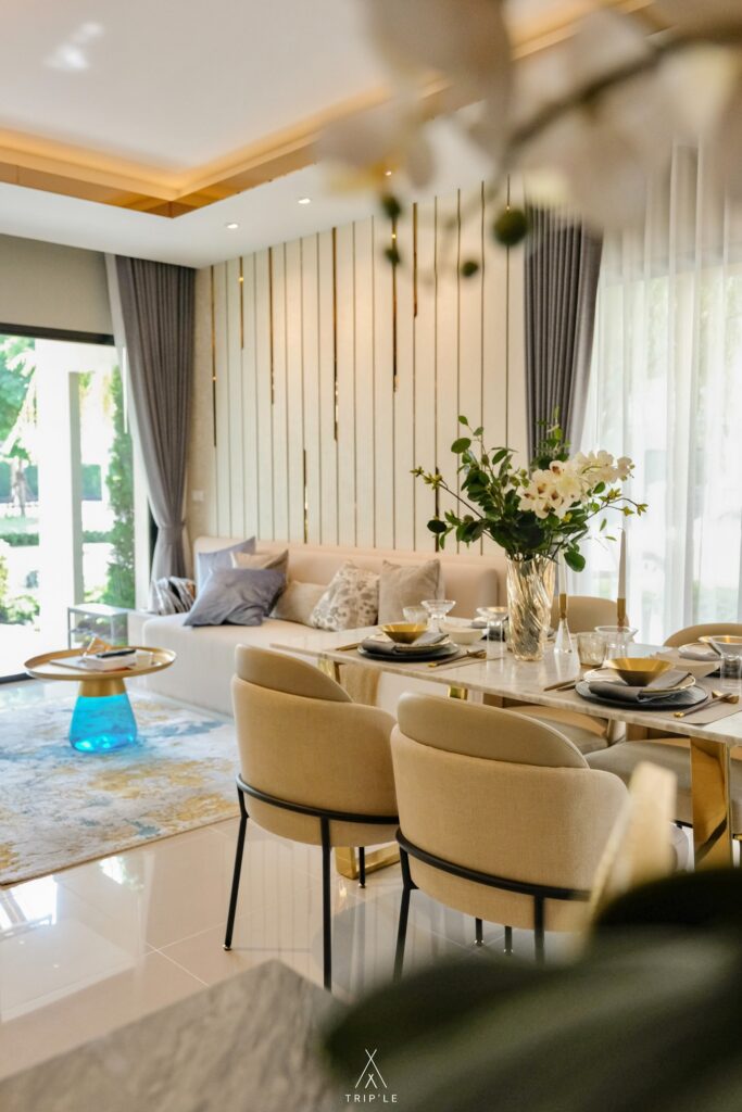 เข้ามาภายในบ้านจะเจอกับห้องนั่งเล่น ซึ่งจะสามารถเชื่อมต่อกับบริเวณโต๊ะกินข้าวได้เลย